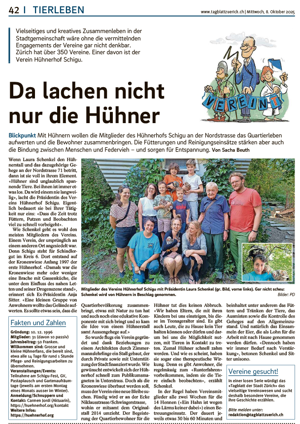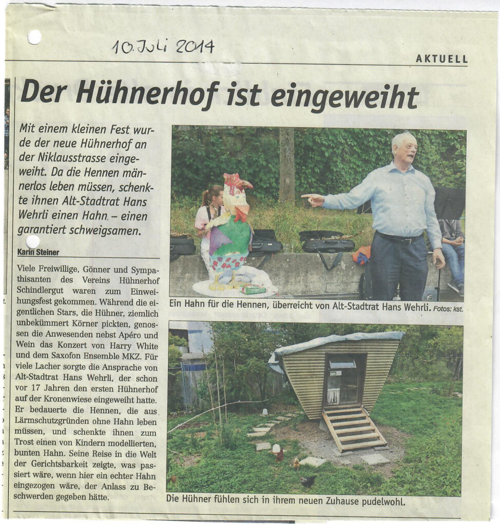 Unsere Hühnerschar belebt das Quartier seit 1996 mit Engagement und Gegacker. Früher auf der Kronenwiese, heute an der Niklausstrasse. Am Hühnergehege treffen sich Jung und Alt, spielen, plaudern oder ruhen sich aus und beobachten das muntere Treiben der Hennen.